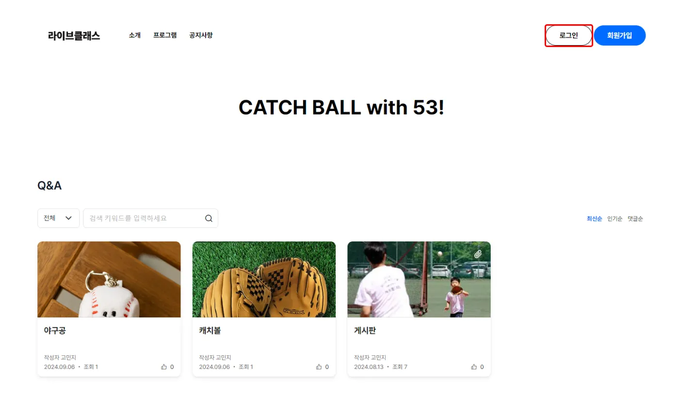사이트 오른쪽 위, 회원가입 옆에 있는 로그인 버튼을 클릭해줍니다.