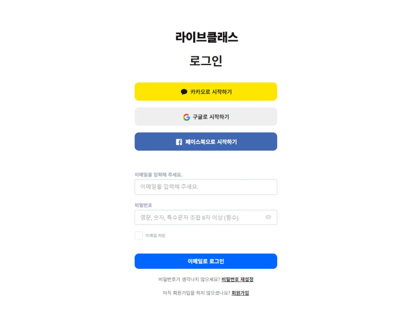 라이브클래스는 이름, 이메일, 비밀번호만 입력하여 간단히 가입할 수 있습니다.