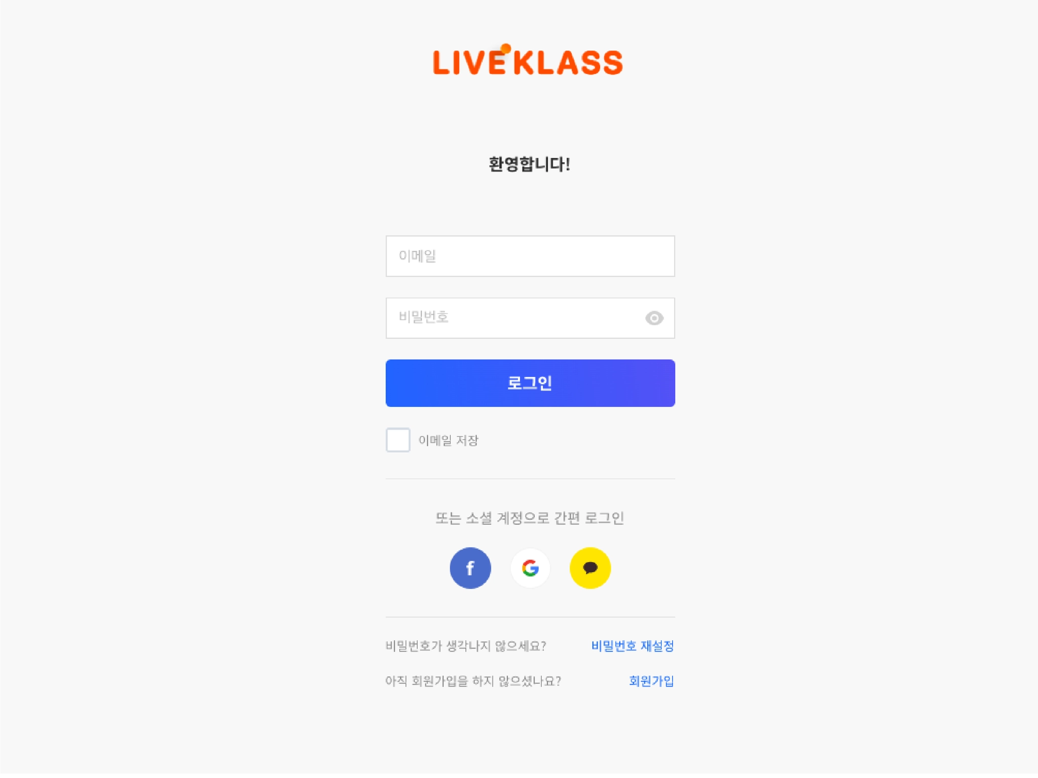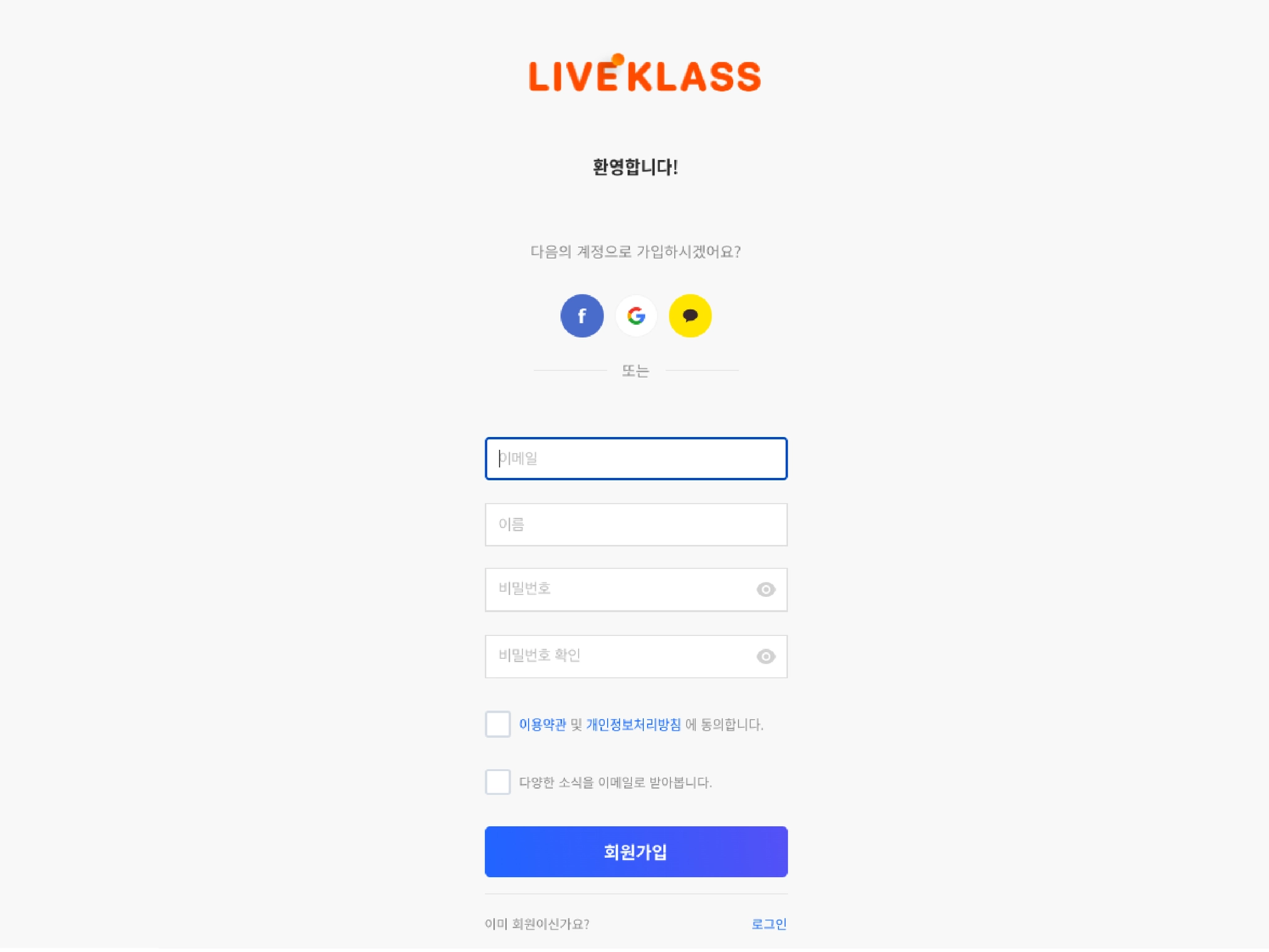 라이브클래스는 이름, 이메일, 비밀번호만 입력하여 간단히 가입할 수 있습니다.