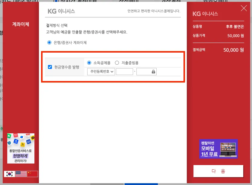 현금결제 건을 클릭하여 현금영수증 버튼을 클릭