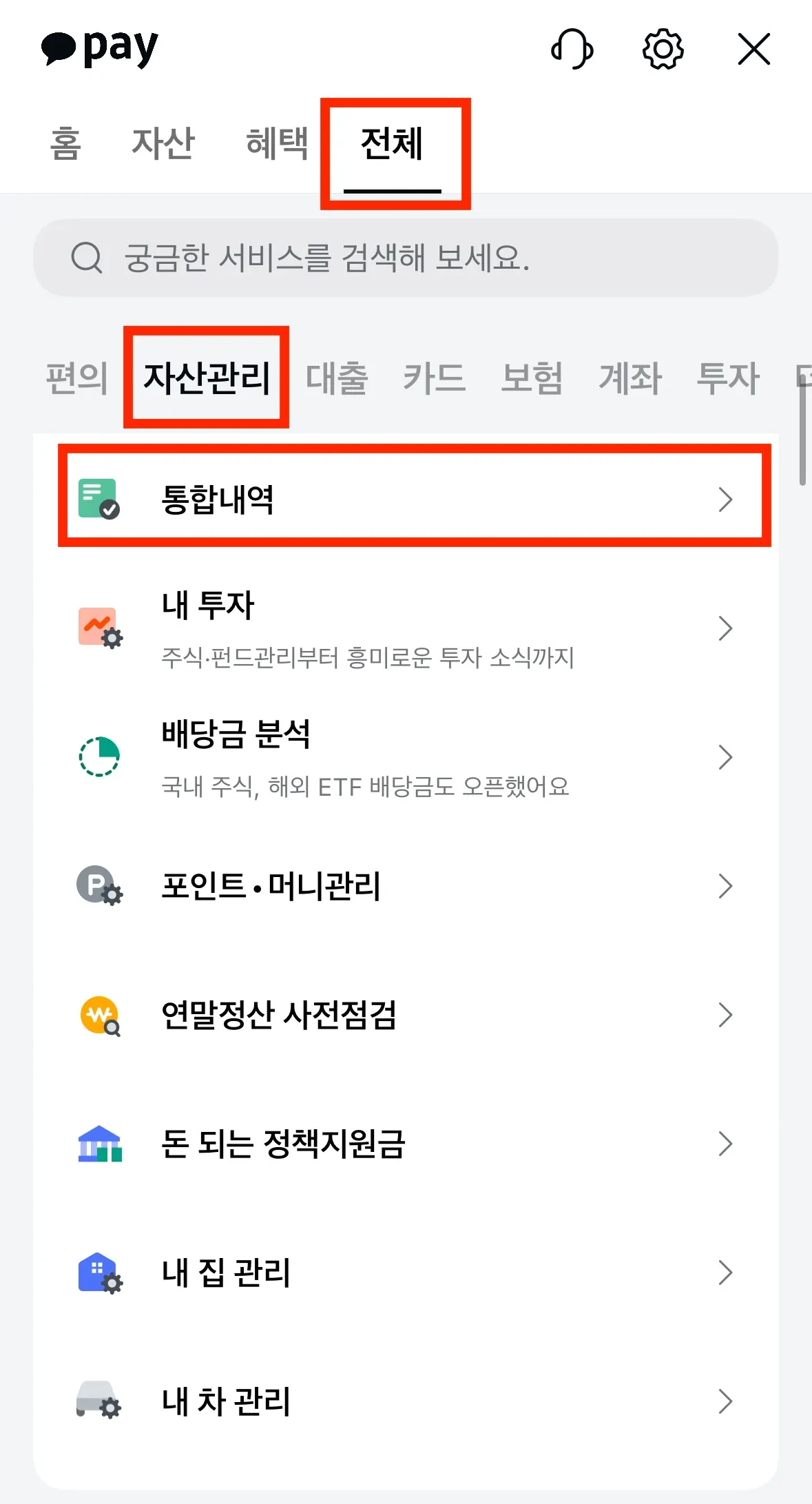 상단의 전체 클릭후 자산관리 - 통합내역을 선택