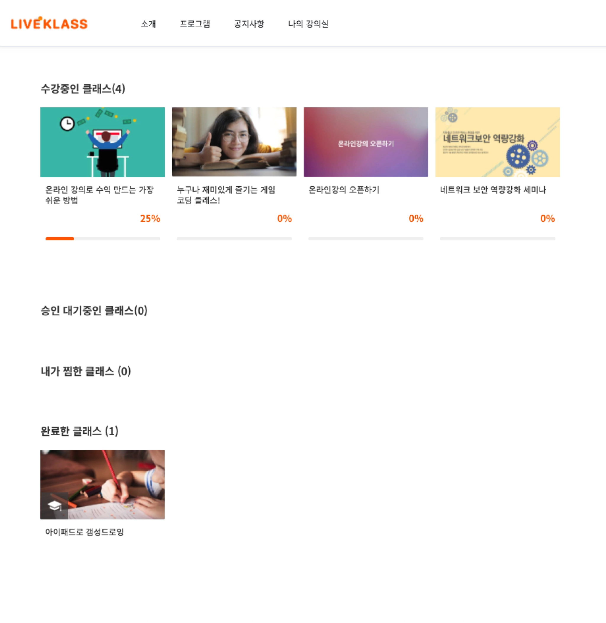 클래스를 확인하러 나의 강의실 / 마이페이지로 이동하시면 수강중인 클래스, 승인 대기중인 클래스, 내가 찜한 클래스, 완료한 클래스를 확인할 수 있어요.