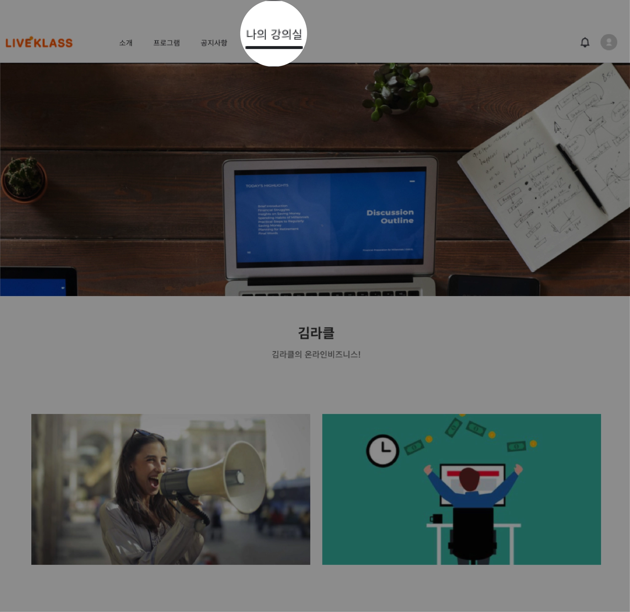 로그인하신 후 상단에 있는 나의 강의실을 클릭하시면 내가 수강하고 있는 클래스들을 확인할 수 있습니다.