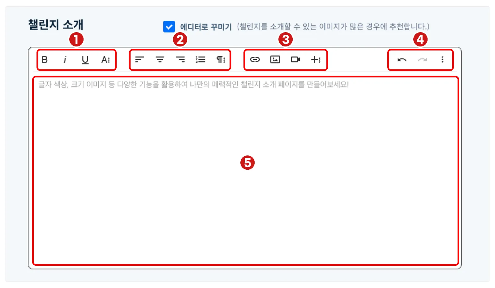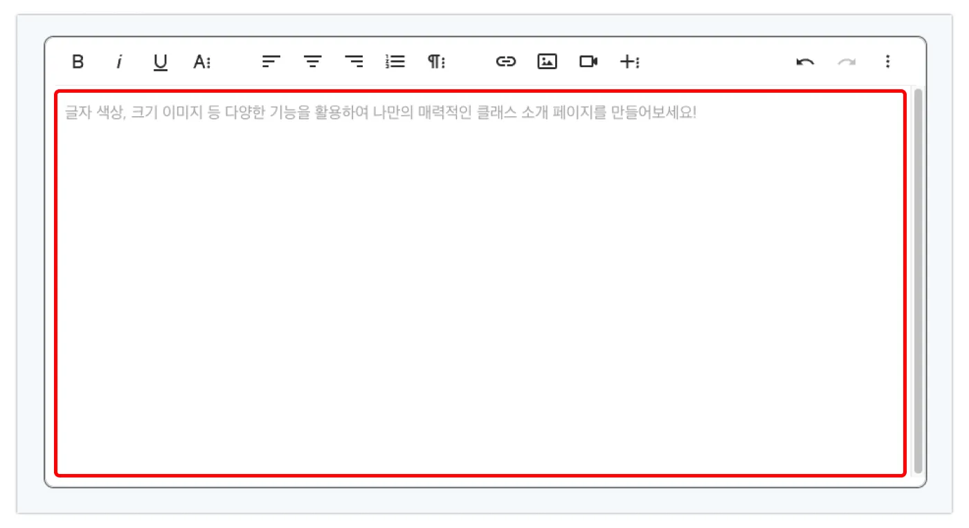 내용을 입력하는 곳으로, 글자 입력은 물론 이미지와 동영상 삽입, 링크 연결 및 파일 첨부 등의 기능을 활용해 원하는 대로 내용을 구성할 수 있습니다.