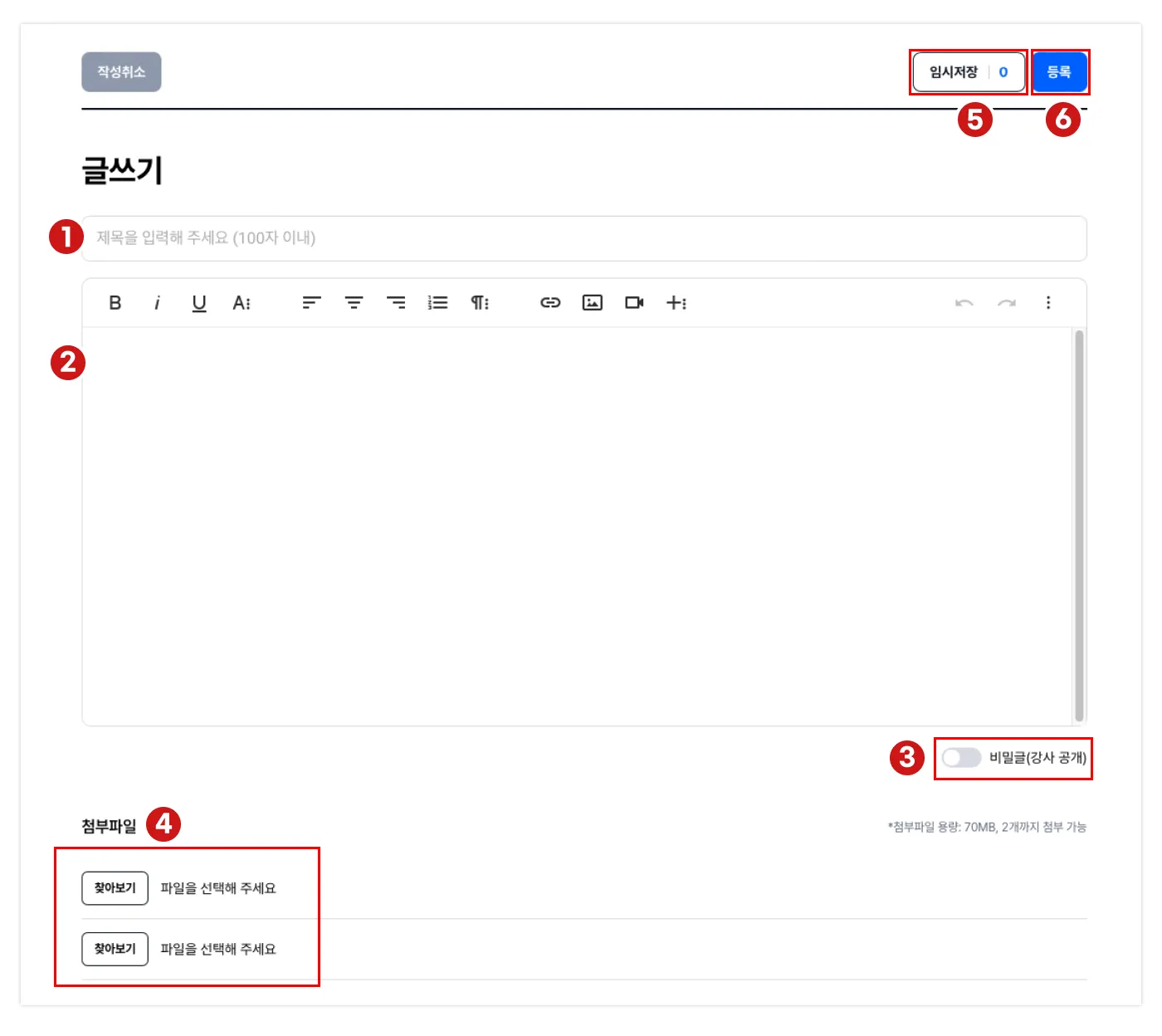 비밀글 설정을 하게 되면, 강사와 글작성자 본인만 작성된 글을 확인할 수 있습니다.