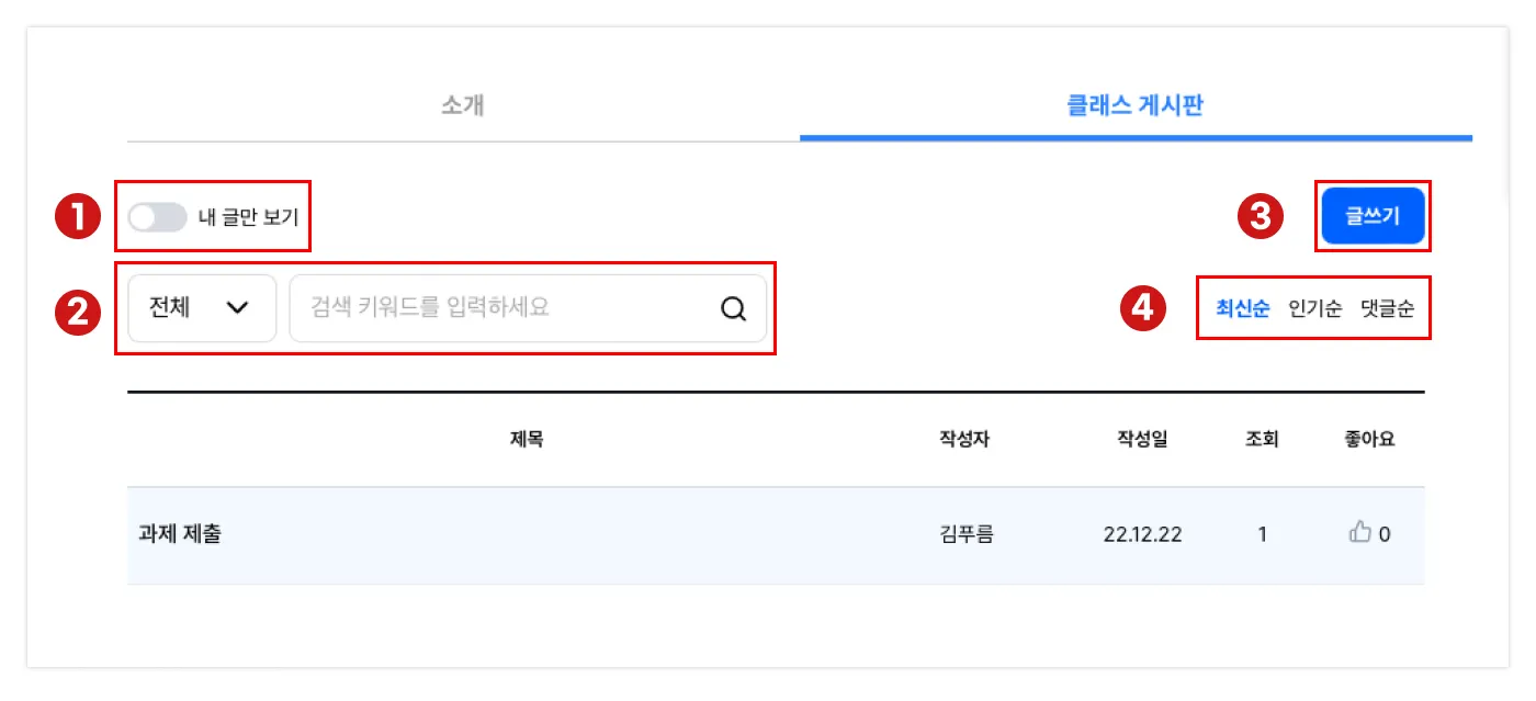 클래스 게시판을 클릭하면 아래와 같이 작성되어 있는 글 목록을 확인할 수 있습니다.