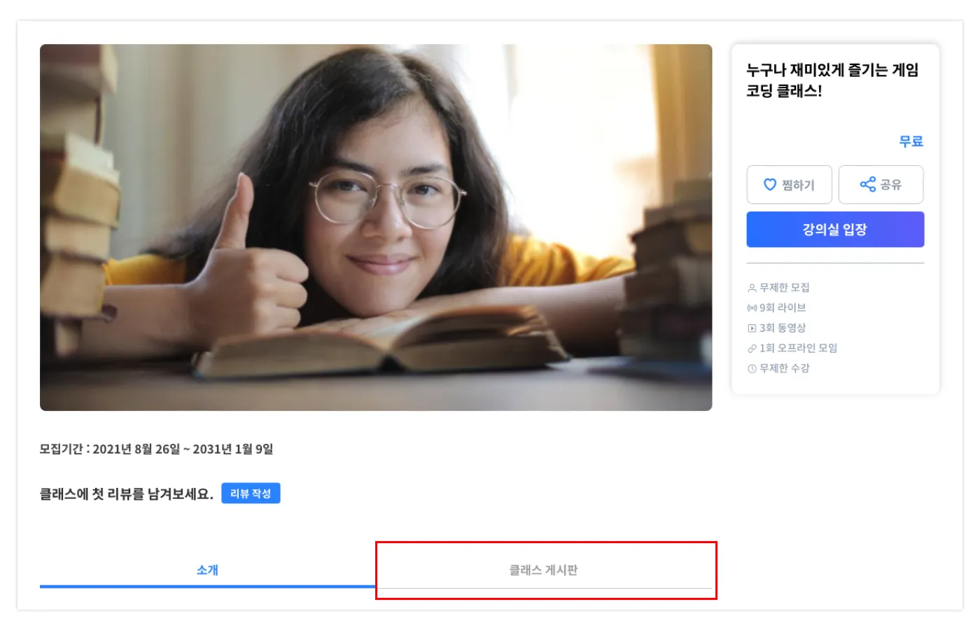 클래스 소개 페이지에서 썸네일 하단의 게시판 이름을 클릭합니다.