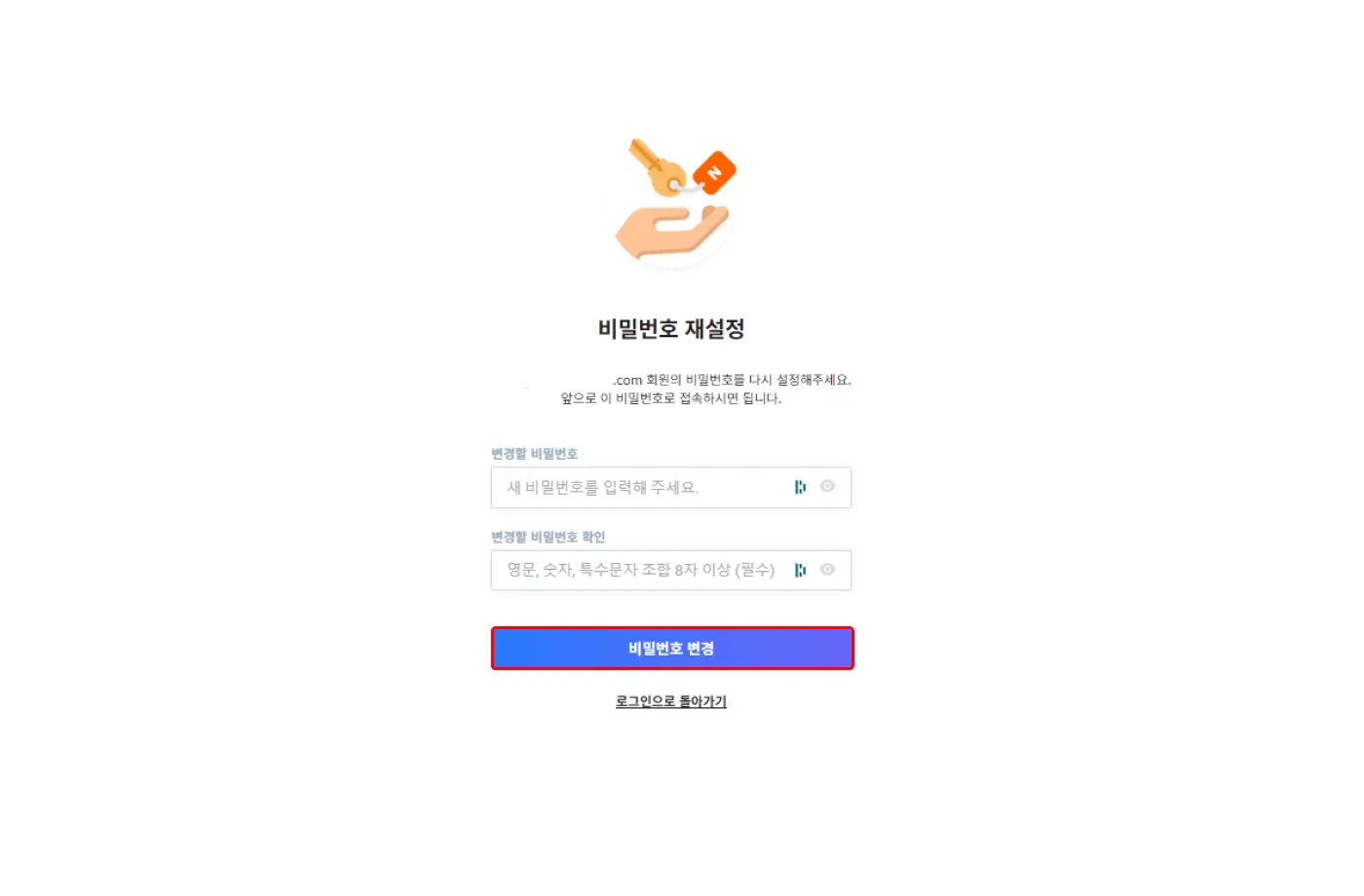 변경할 비밀번호를 입력한 후 비밀번호 변경을 클릭해 로그인을 진행합니다.