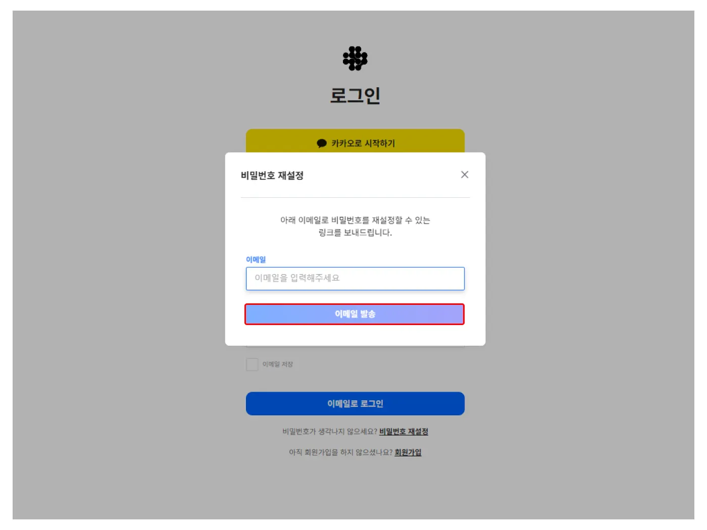 가입하신 이메일 주소를 입력한 후 이메일 발송 버튼을 클릭합니다.