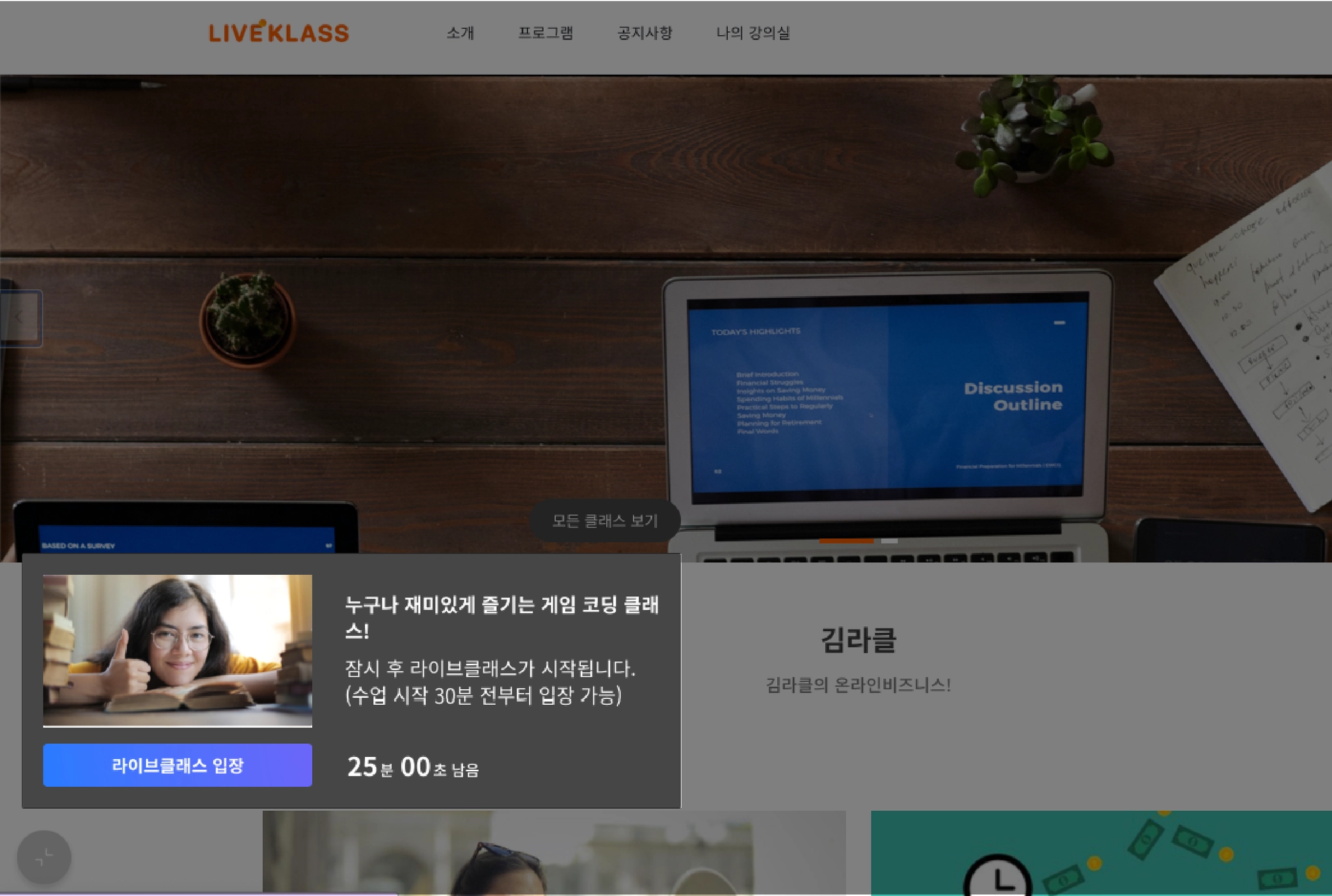 라이브 수업이 시작되기 1시간 전부터 라이브클래스 페이지 하단에 팝업 배너가 뜹니다.