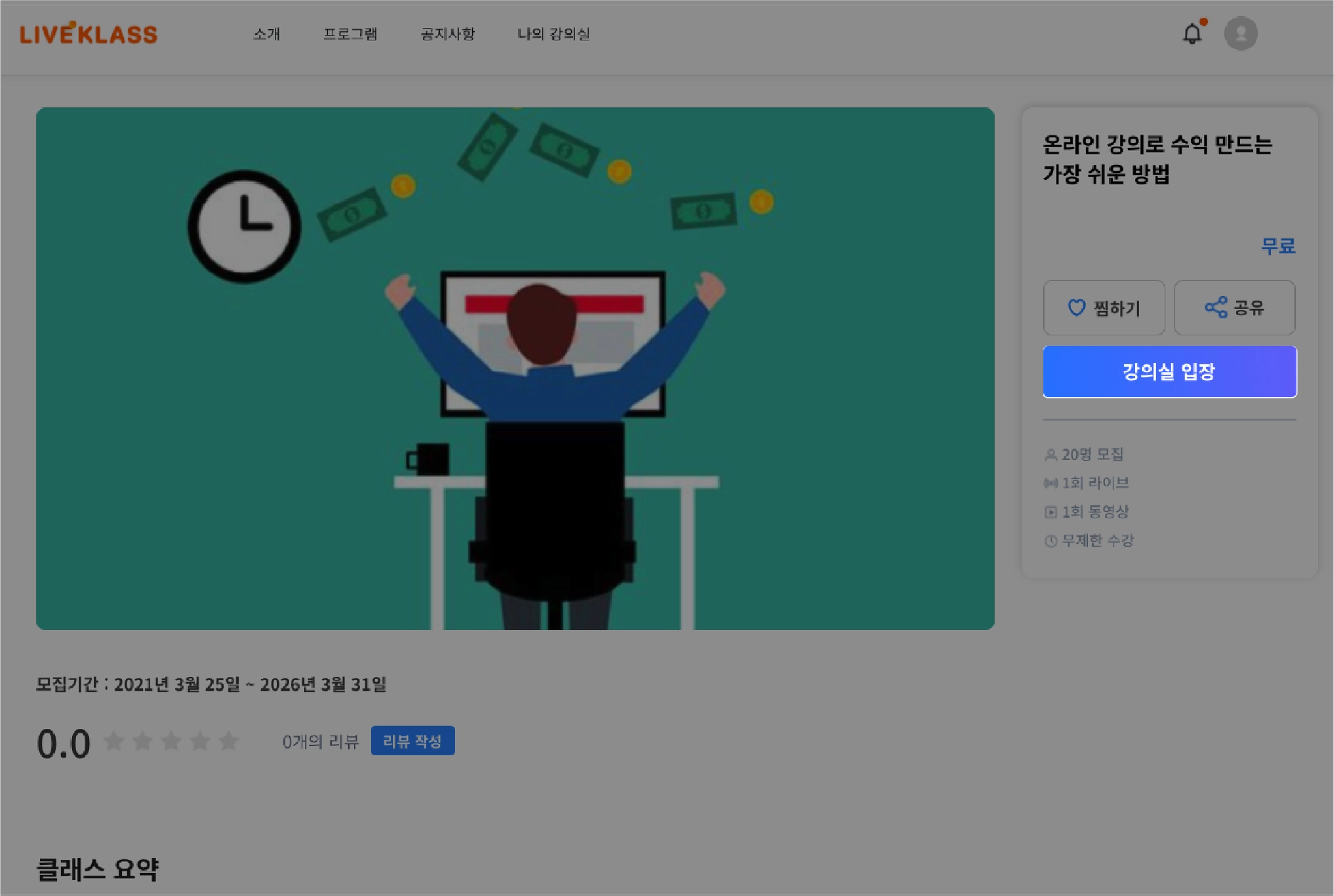 수강 신청을 한 수강생은 입장 버튼을 클릭하여 라이브 수업에 참여할 수 있습니다.