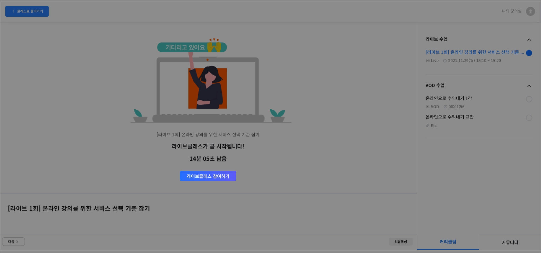 라이브 수업은 정해진 시간에 시작되기 때문에 미리 준비해주시면 좋아요.
