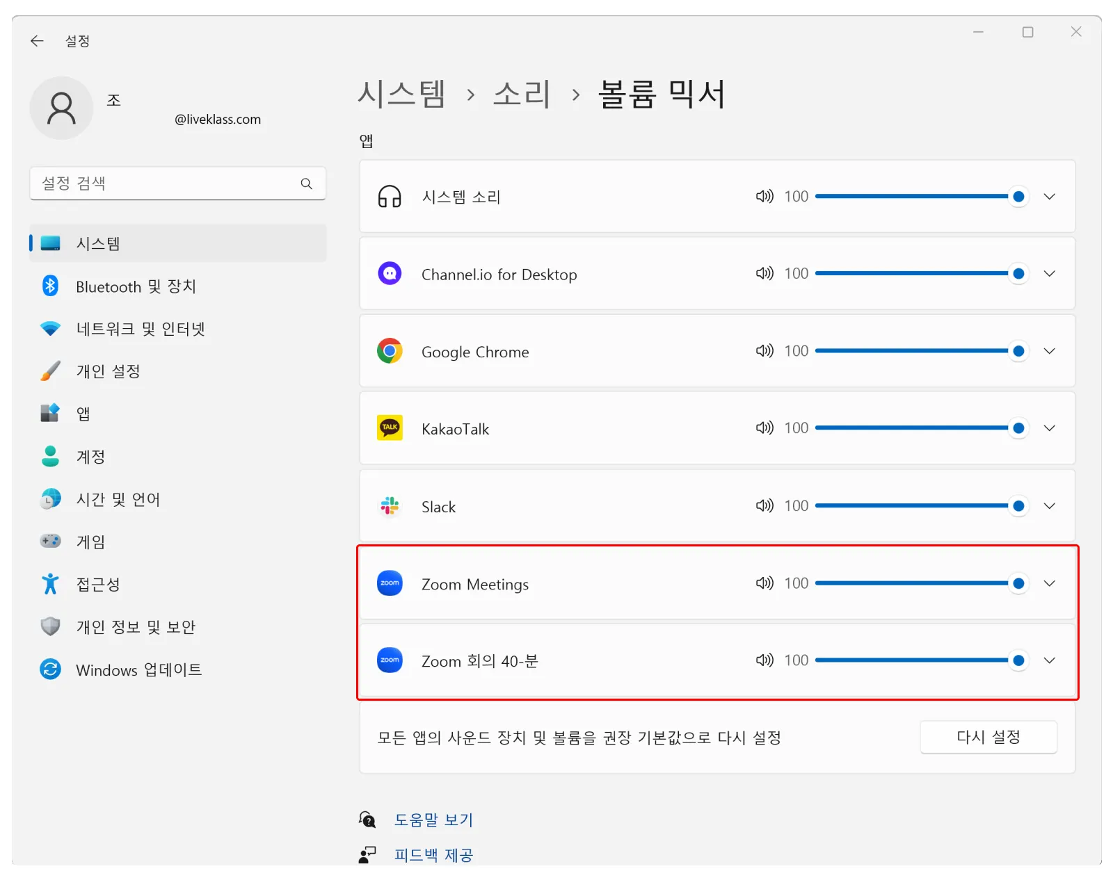 볼륨 믹서에서 Zoom에 해당하는 스피커를 확인합니다.