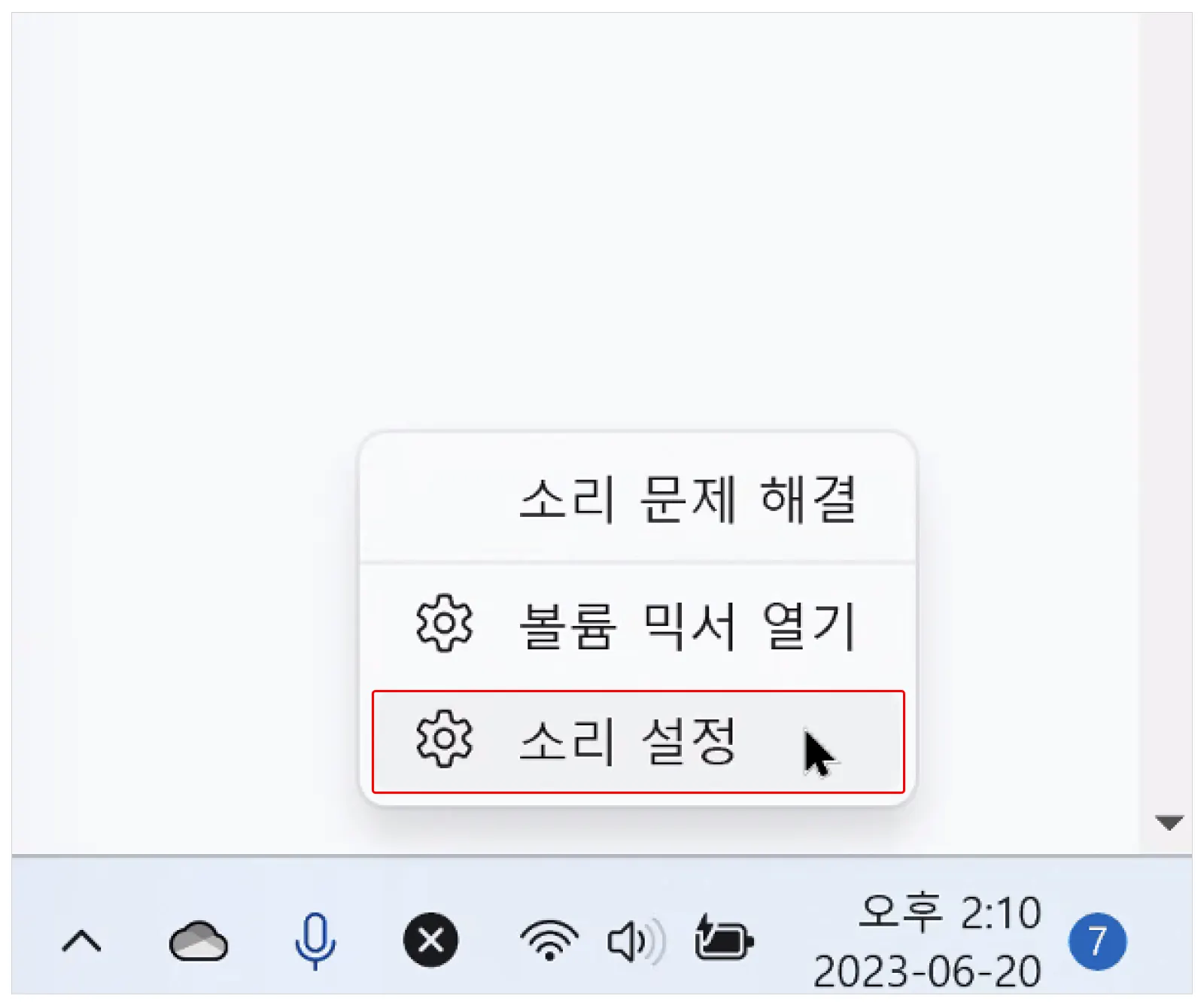 오른쪽 하단의 스피커 아이콘을 오른쪽 마우스로 클릭하고, 볼륨 믹서를 열어줍니다.