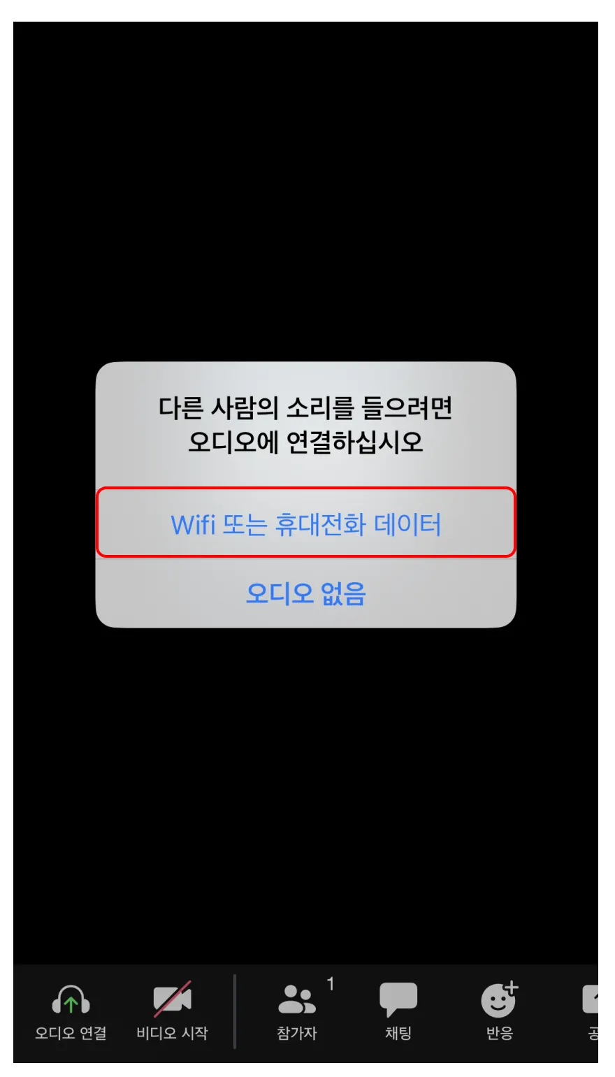 Zoom 회의 중간에 연결하려면, 화면 왼쪽 하단의 오디오 참가 버튼을 누르고, Wifi 또는 휴대전화 데이터를 클릭해 주세요.