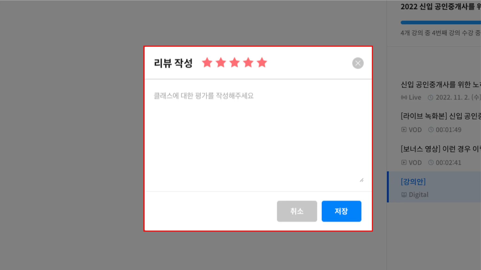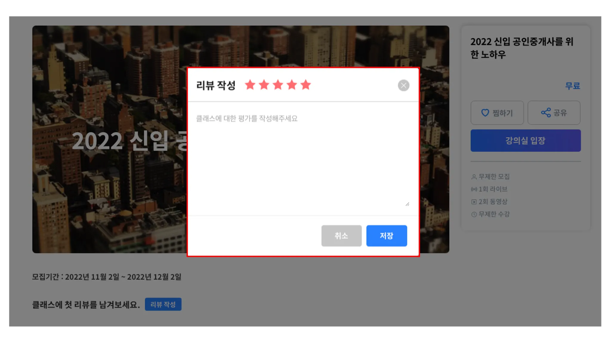 2-3. 리뷰 작성 팝업창이 오픈되면 별점을 설정할 수 있고, 클래스에 대한 평가를 직접 작성하실 수 있습니다.