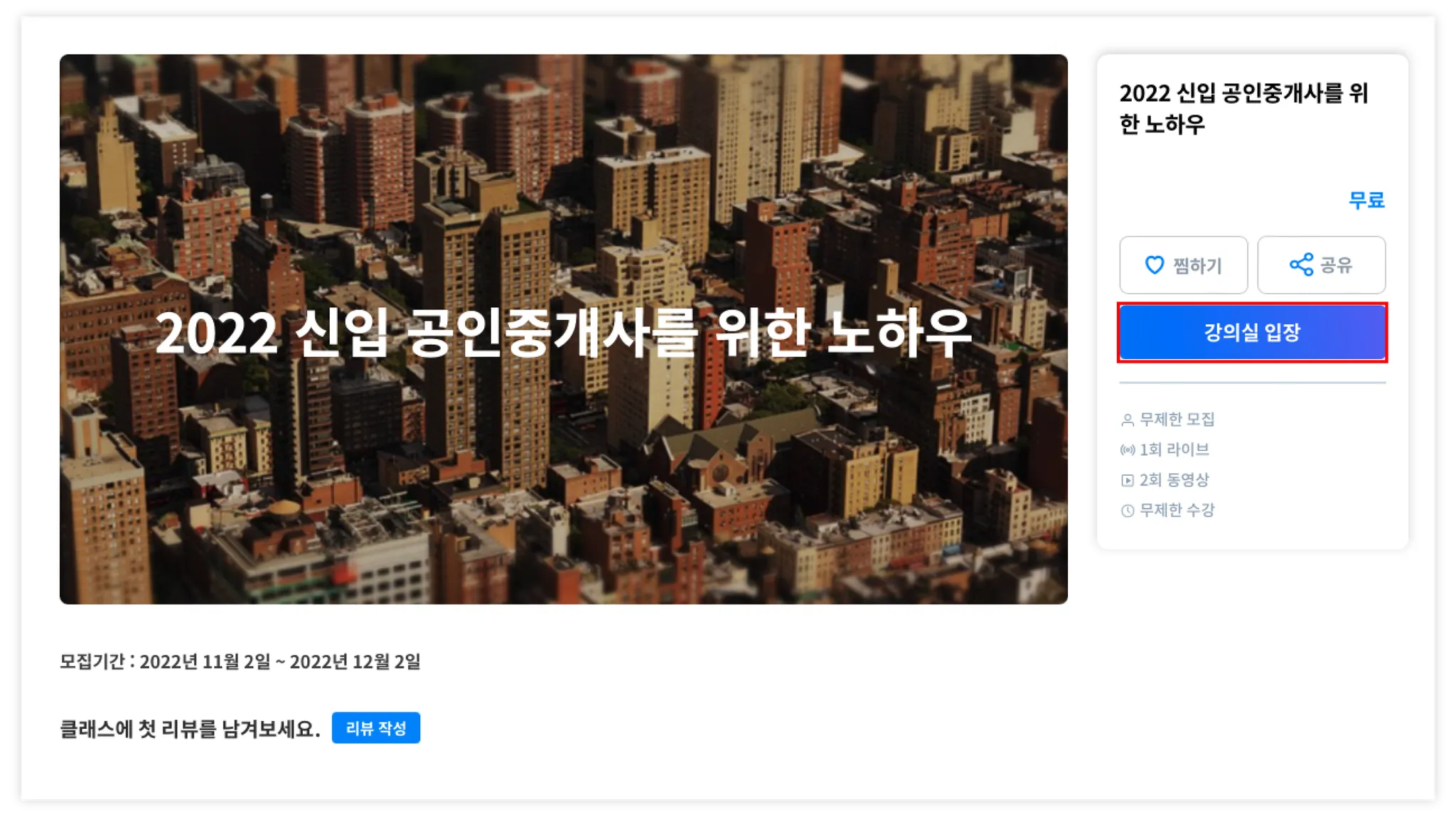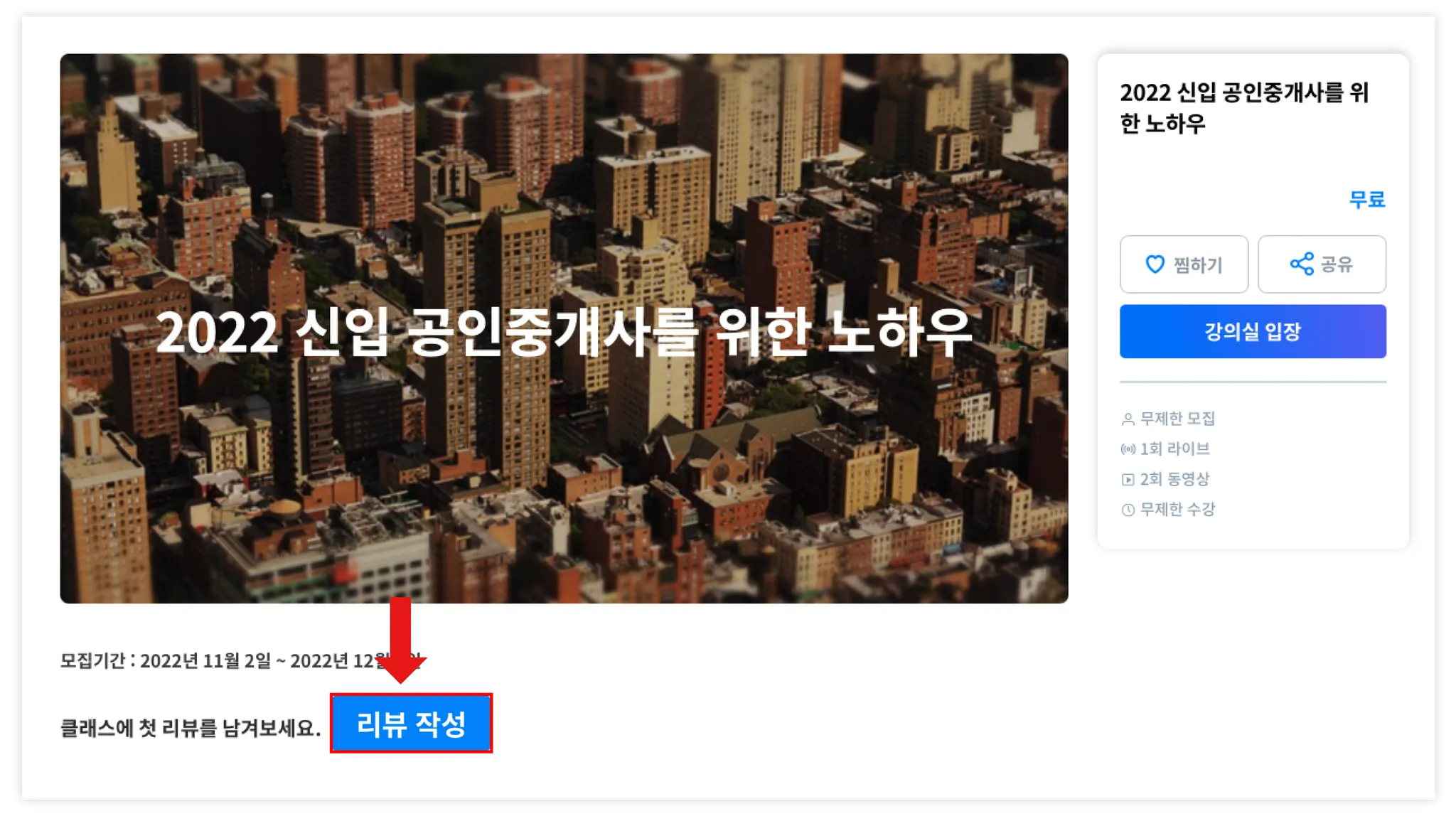 1-1. 리뷰를 작성하실 클래스에 접속해 클래스 이미지 하단에 있는 ‘리뷰 작성’ 버튼을 클릭합니다.
