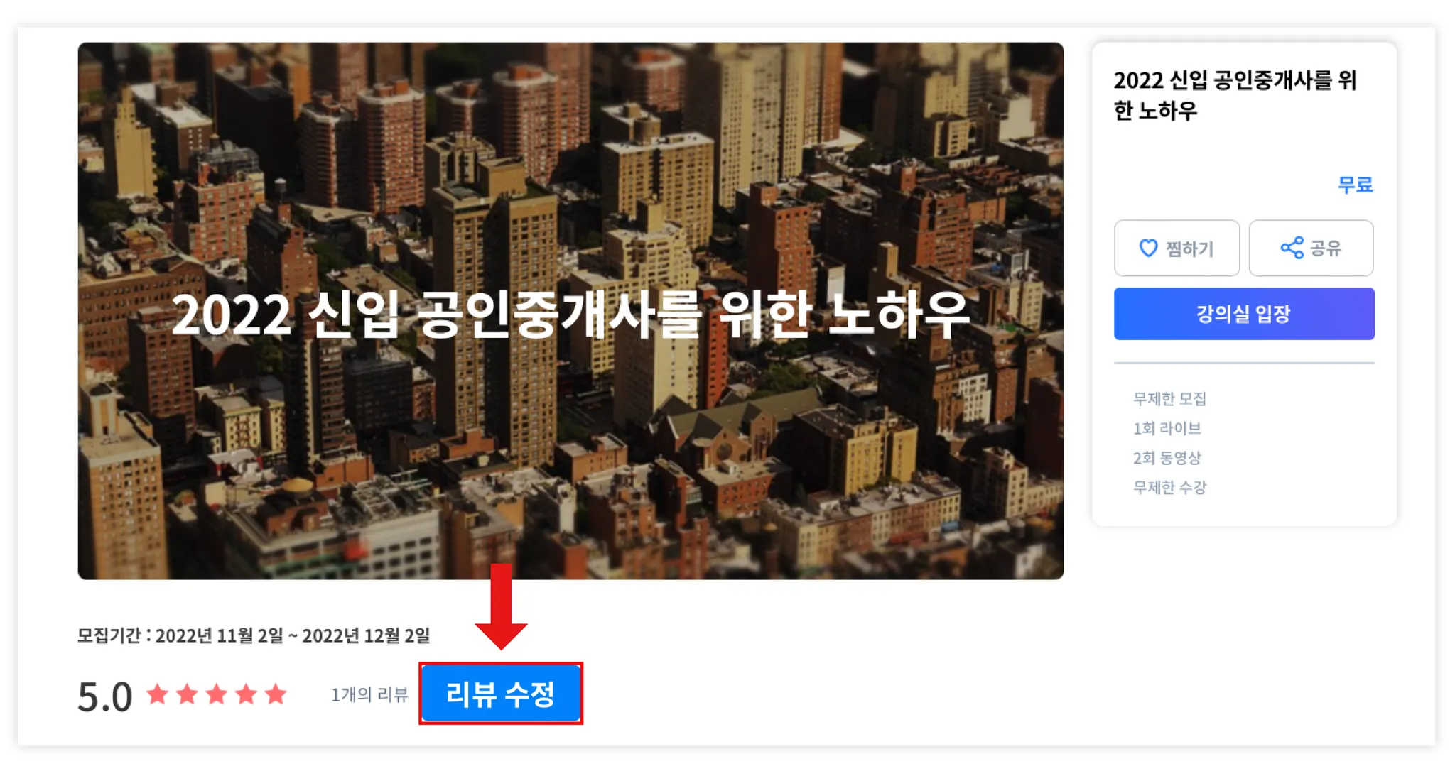 4-1. 리뷰를 작성하신 후 수정하고 싶으시다면 클래스 이미지 하단의 ‘리뷰 수정’ 버튼을 클릭해주세요.
