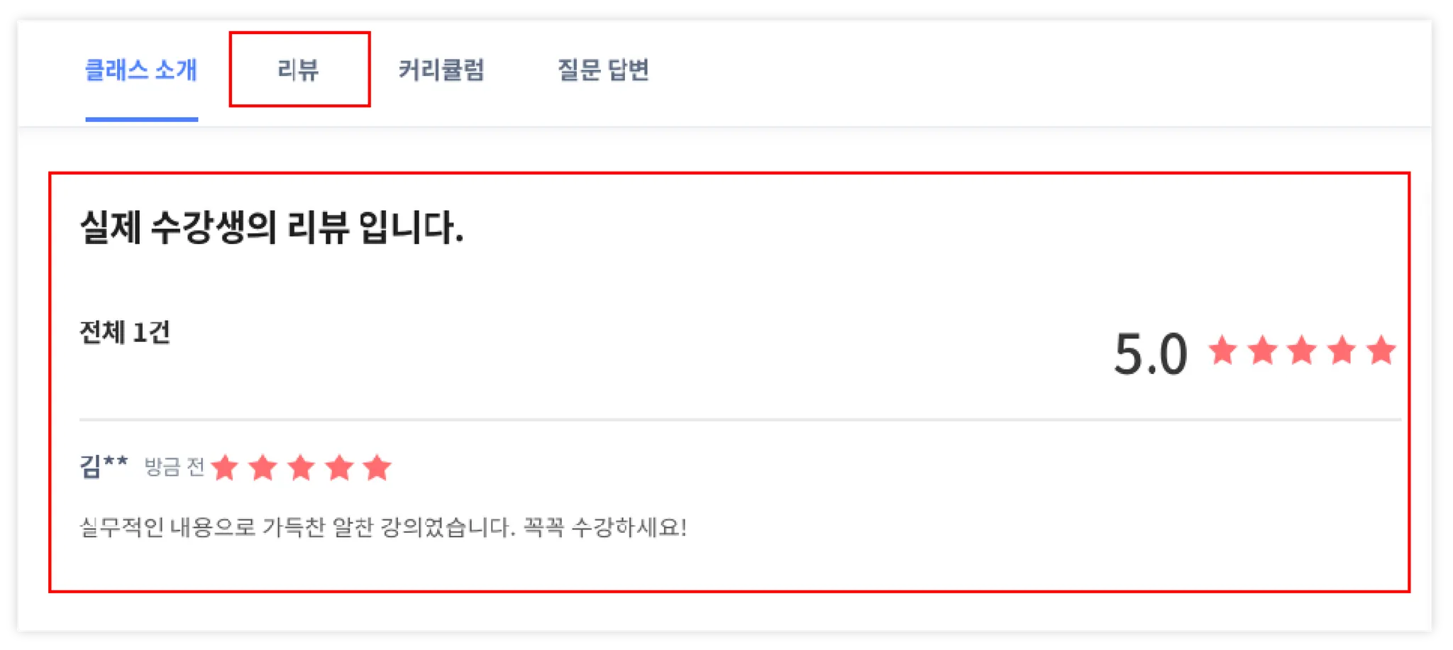 작성하신 리뷰는 클래스 소개 하단에 위치하고 있습니다.