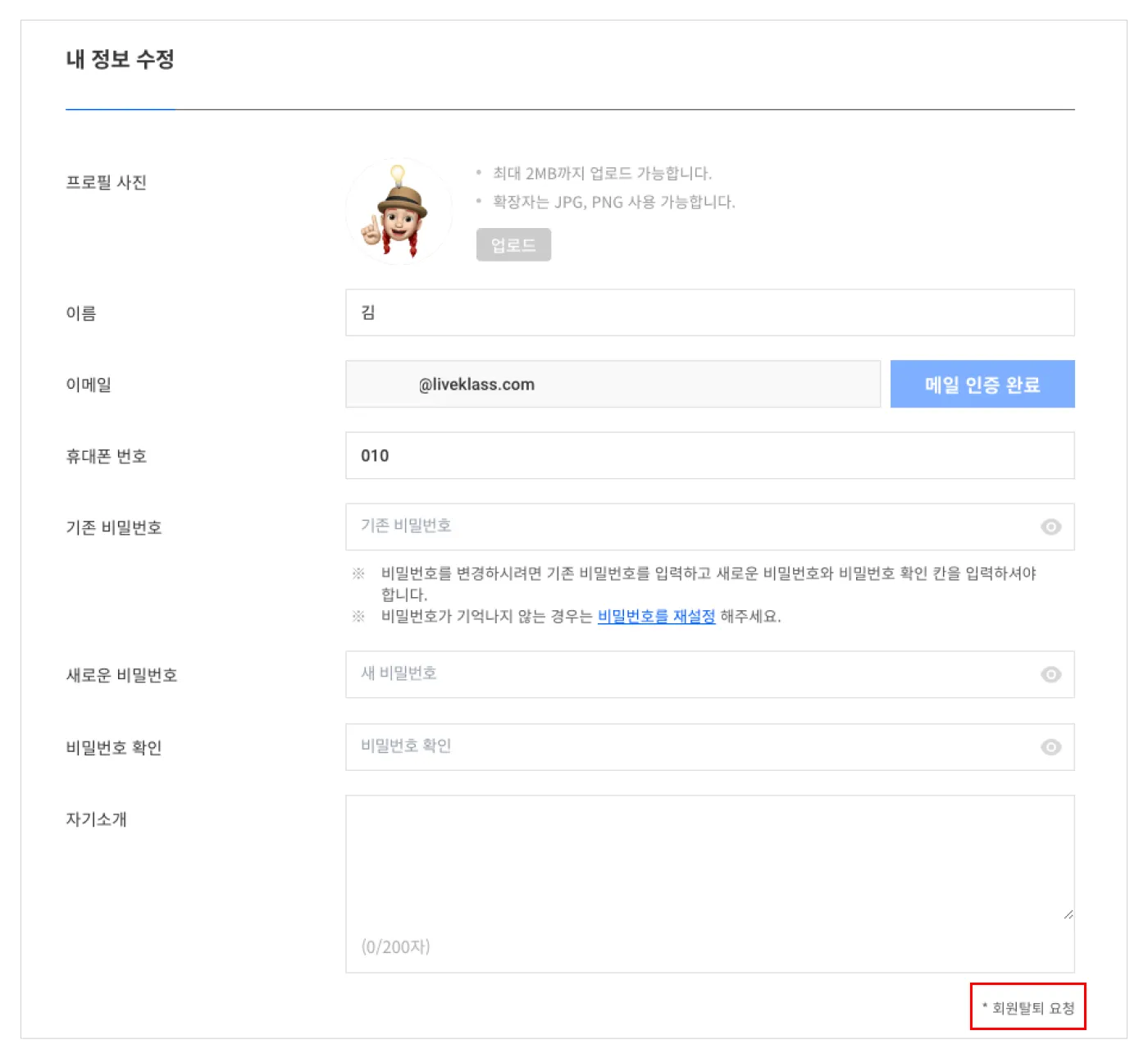 내 정보 수정 페이지 하단의 회원탈퇴 요청을 클릭하여 내용을 입력한 뒤 제출해주시면 됩니다.