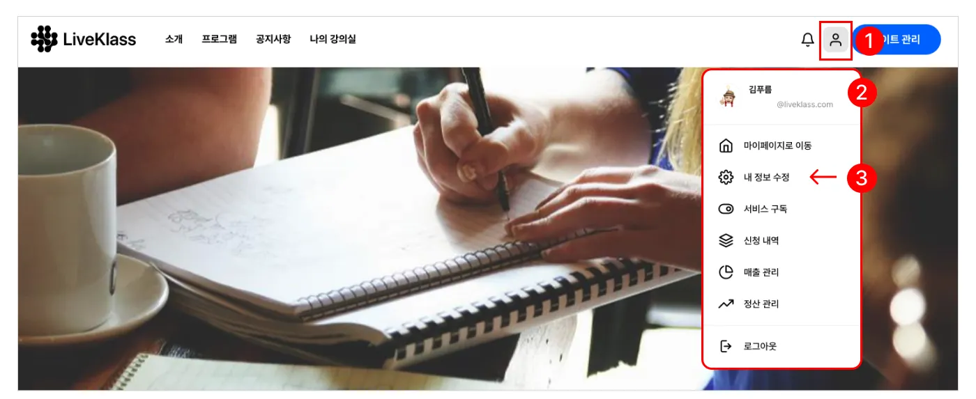 ③ 내 정보 수정에서 내 개인정보를 확인하고 관리할 수 있습니다.