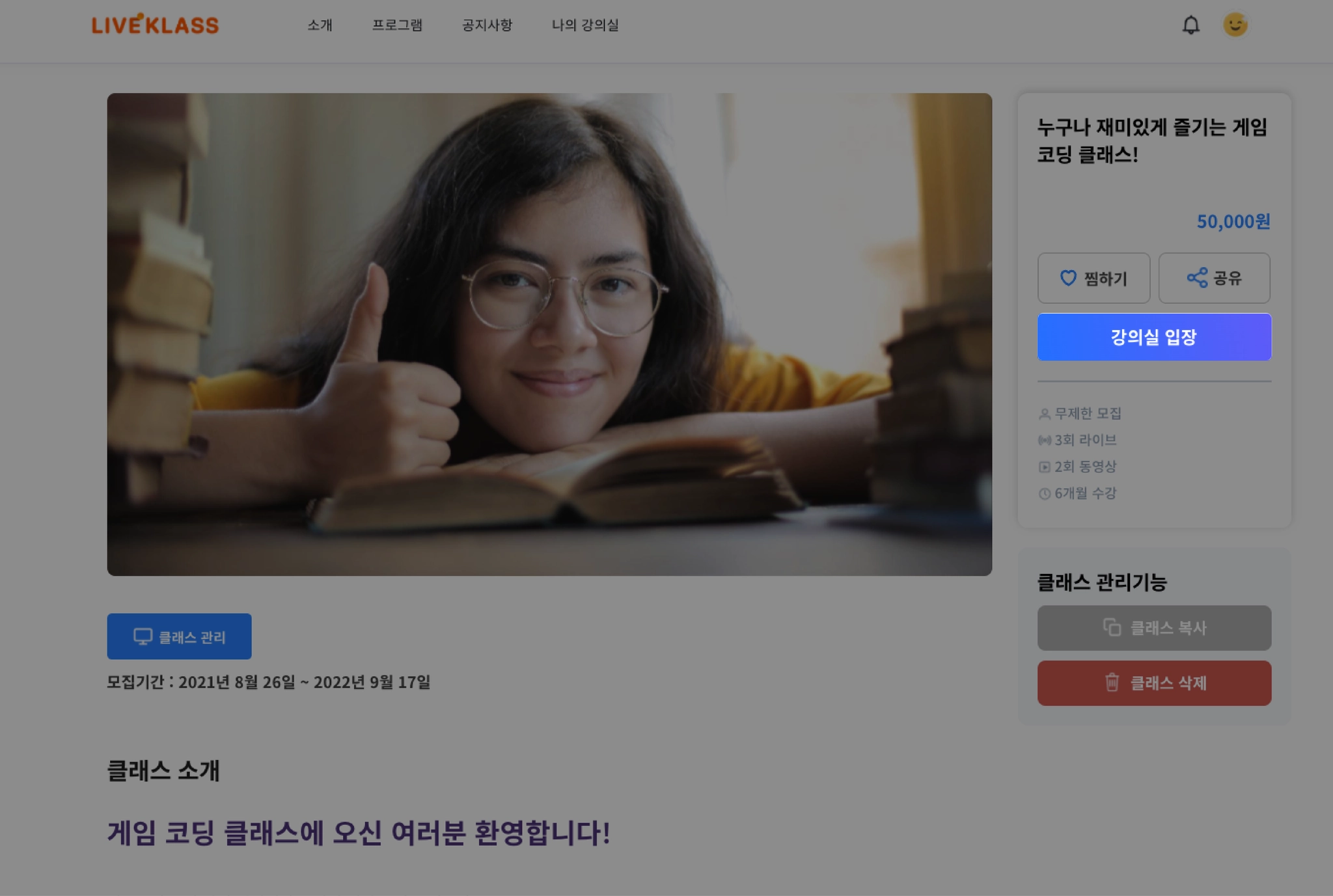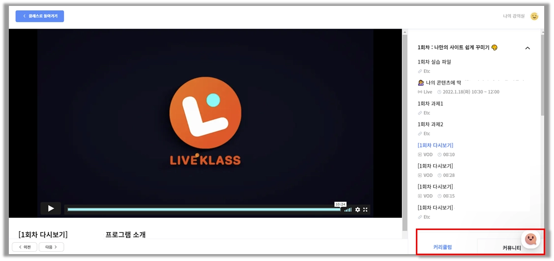 수강 신청을 한 클래스 소개 페이지에서 학습할 수 있습니다.