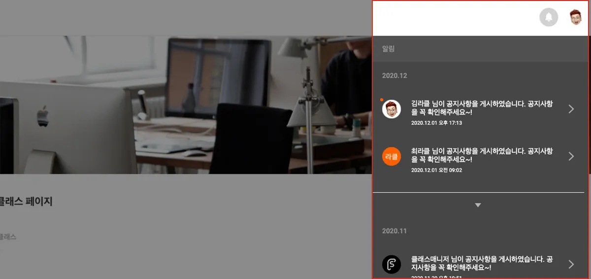 알림은 웹페이지에 로그인하셔야 확인할 수 있습니다. 현재 소리 또는 메시지 형태의 알림은 제공되지 않는 점 유의해주세요.