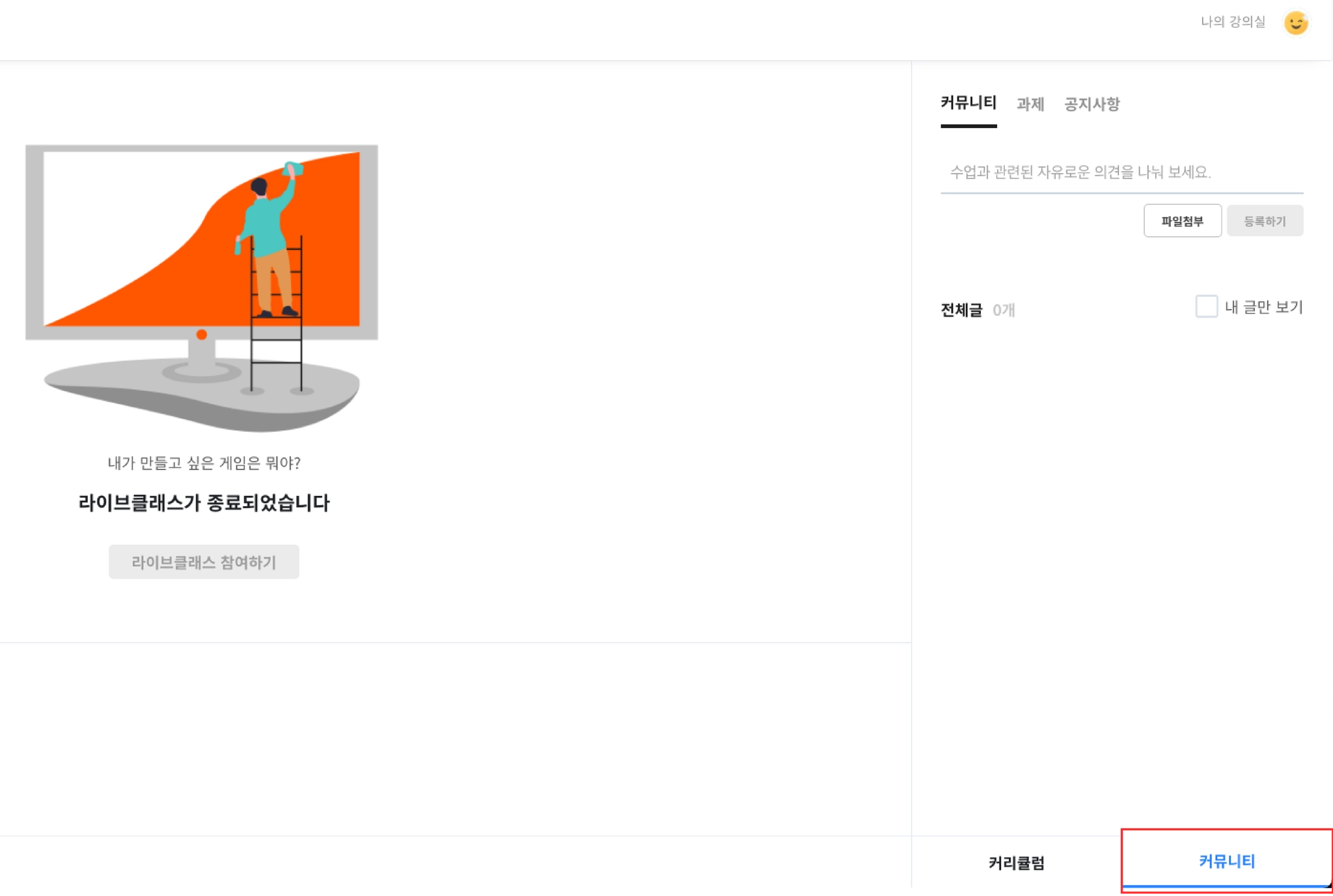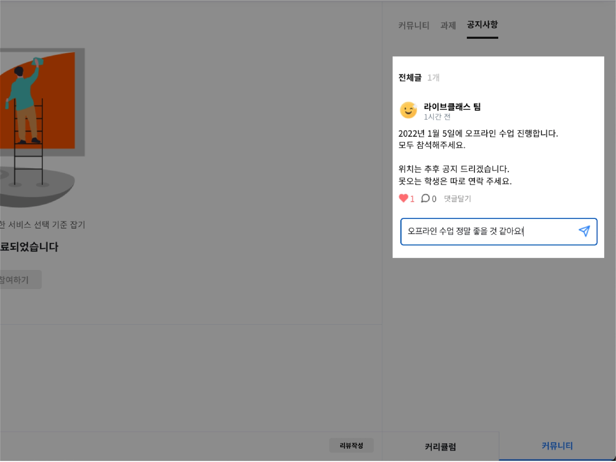 클래스 관리자 및 강사만 공지사항에 글을 올릴 수 있으며, 수강생은 공감버튼 클릭과 댓글만 달 수 있습니다.