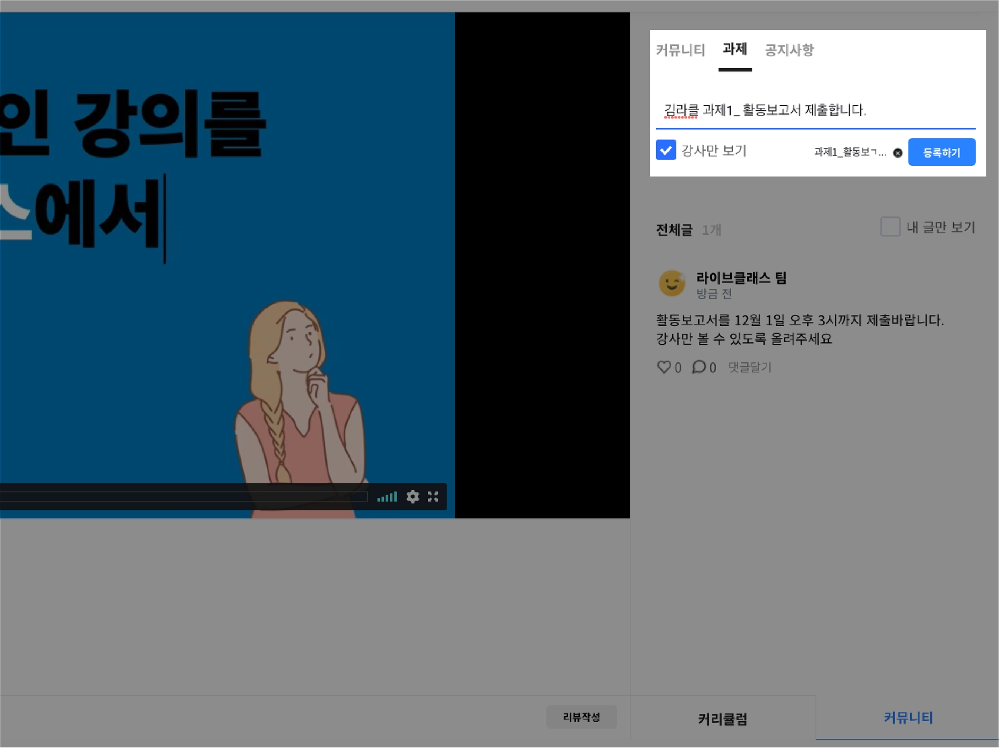 커뮤니티 내 과제 기능을 통해 과제를 확인하고 제출할 수 있습니다.