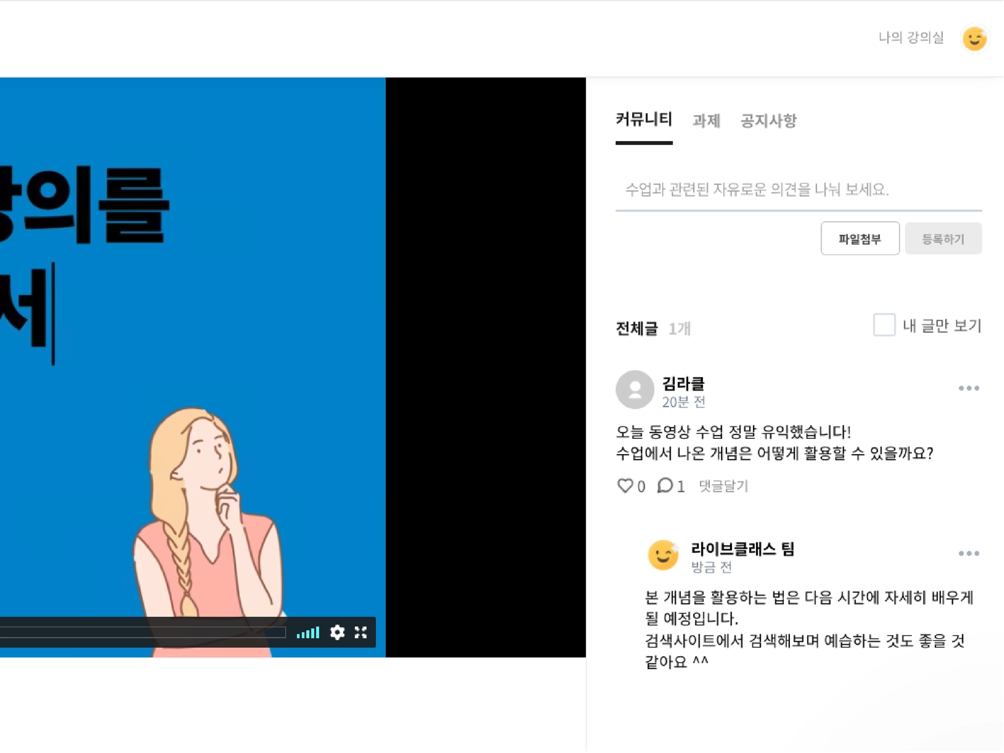 커뮤니티 글과 댓글을 활용해 강사님, 수강생들과 다양한 주제로 이야기를 나누며 학습해보세요.